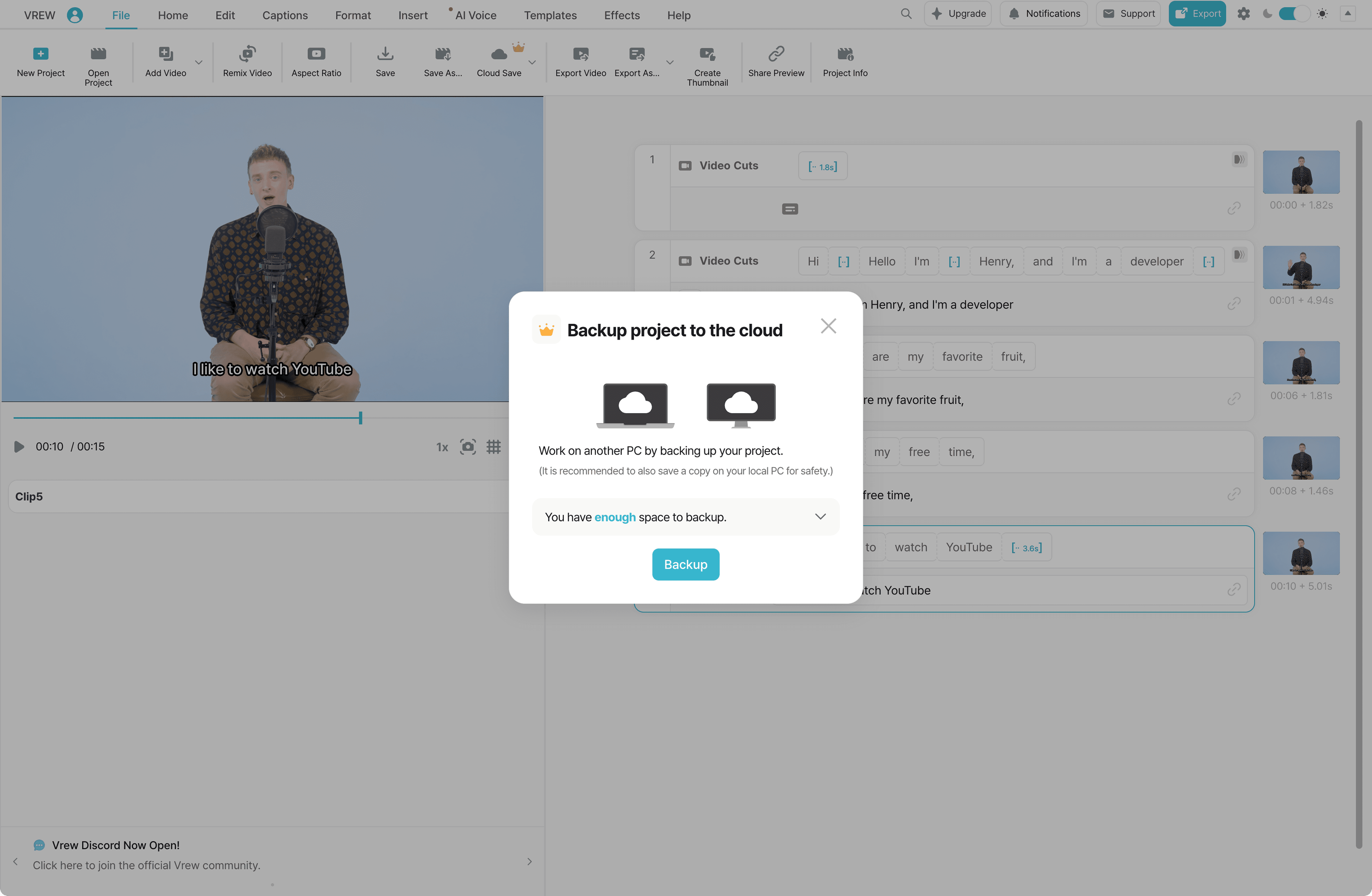 Vrew 앱에서 ‘프로젝트 백업’을 클릭해 주세요. 현재 작업 중인 프로젝트가 클라우드에 저장됩니다.