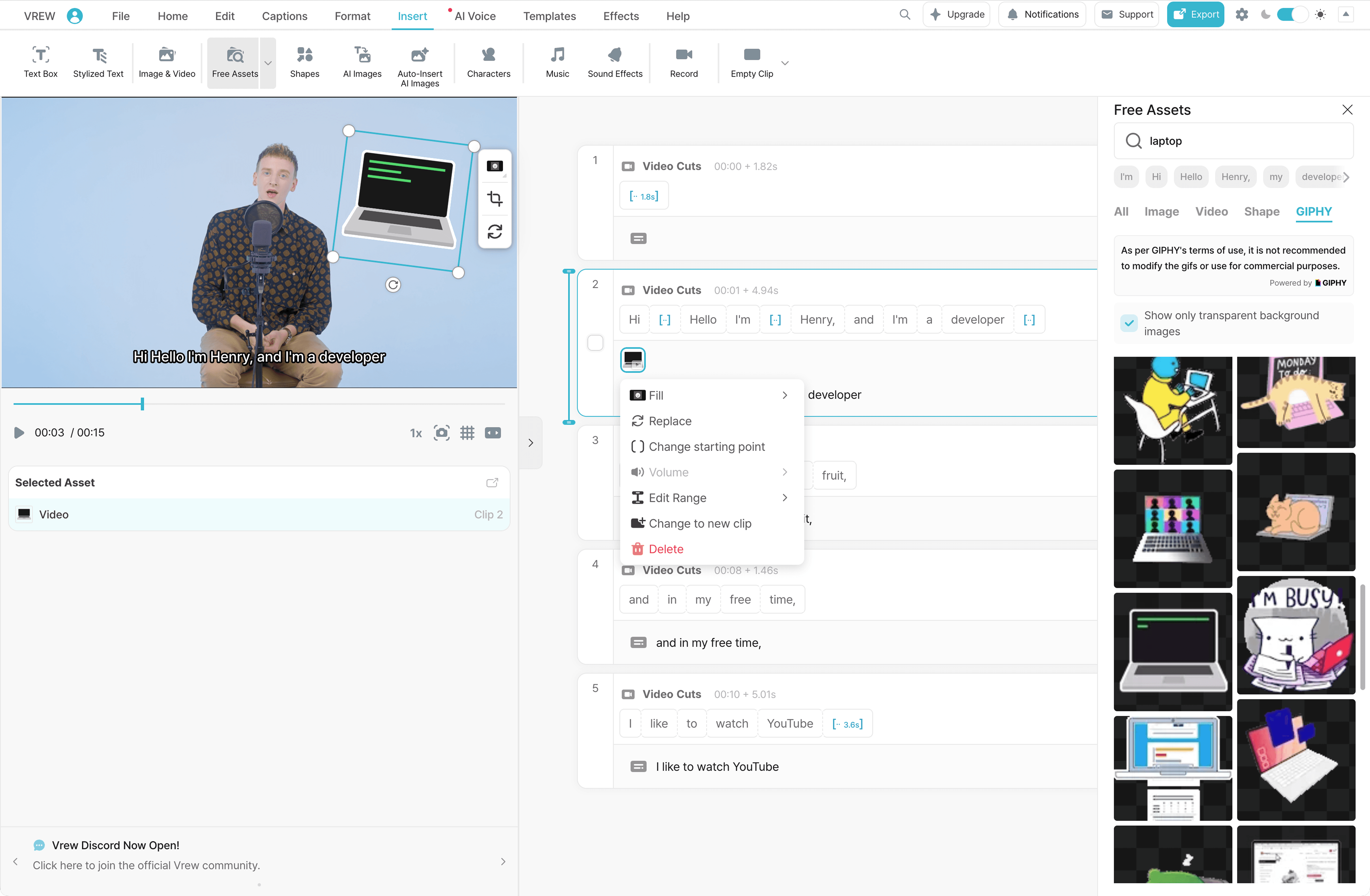 Vrew 삽입에 있는 디자인 텍스트부터 무료 이미지·비디오, 효과음, 배경 음악 등 필요한 소스를 선택합니다.
