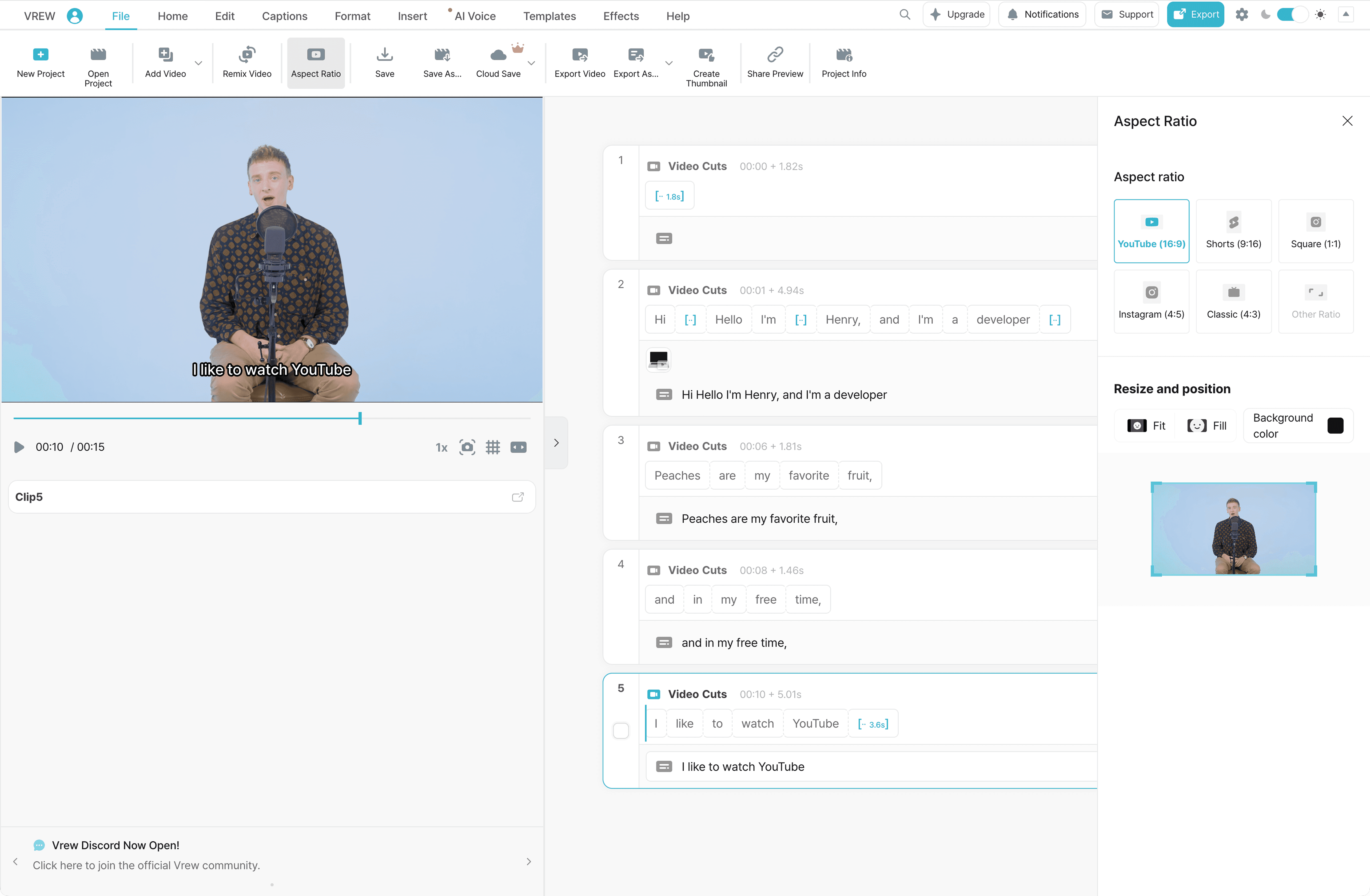 Vrewでは、動画をさまざまな比率に変換できます。