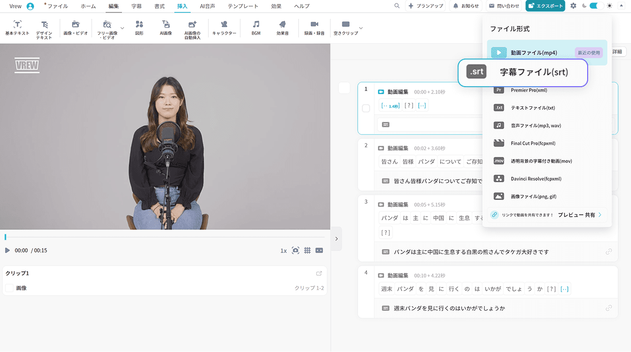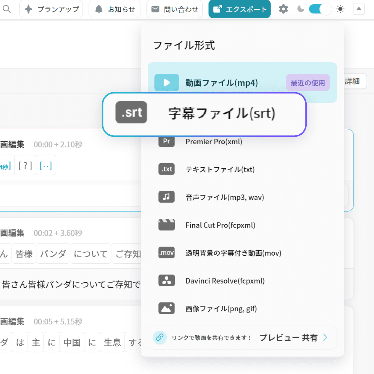 AI自動翻訳の様々な国の言語での字幕ファイルを制作できます。